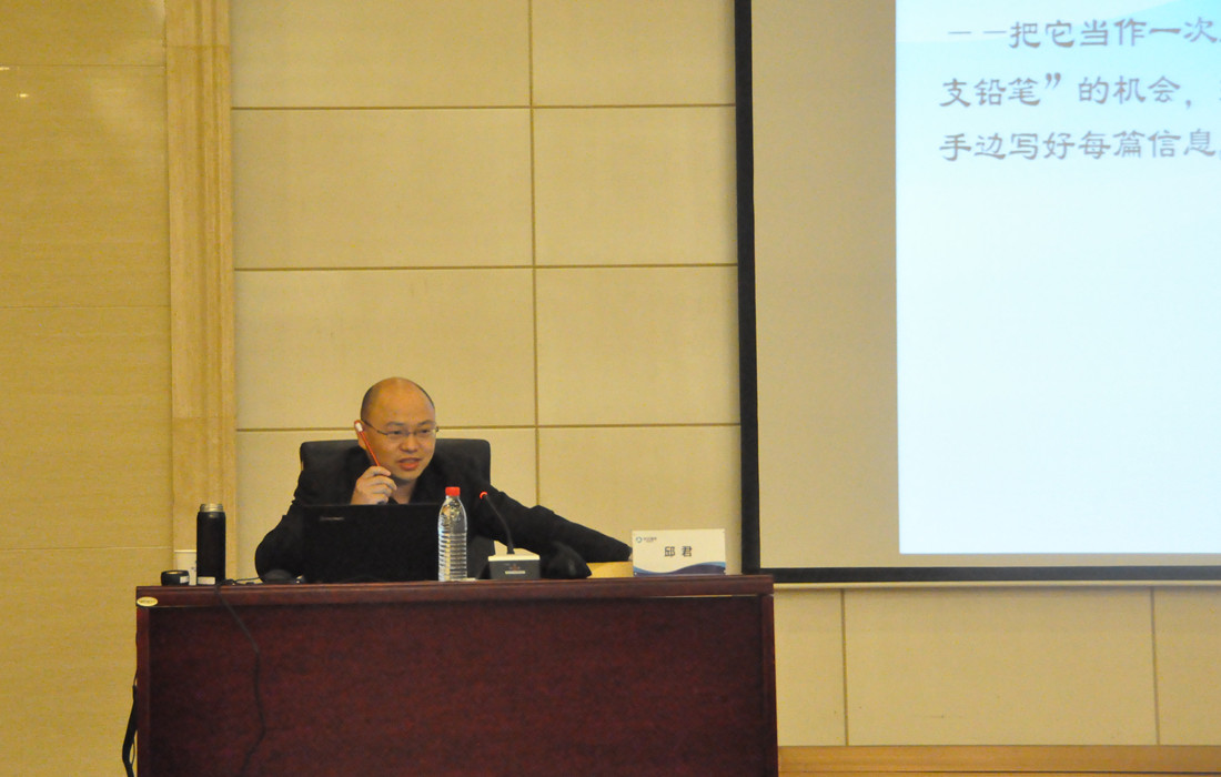本期培训特邀襄阳市政府办公室信息科邱君主讲。邱科长长期从事文字材料写作工作,具有深厚的理论基础和丰富的实践经验,参与起草的文稿先后发表在《中国建设报》《国土资源报》《湖北日报》等刊物。邱科长从事信息工作以来,襄阳市在省政府政务信息考核排名中始终保持全省前列。授课过程中,邱科长以一支铅笔自喻并分享政务信息写作体悟。从一支铅笔抓住被“握”的机会、充实内在铅芯、被“削”出精品、低“头”反省擦拭、留下平实光辉印记五个方面,结合5G影院 实际形象阐述政务信息的重要性、如何充实政务信息、如何提升政务信息写作的硬实力、如何改进政务信息的思维偏差常规定式、如何看待政务信息的这班岗位。最后,以一首表达信息员心声的诗歌《平凡的信息员》圆满结束本次培训。